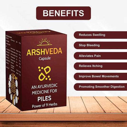 Say Goodbye to Pile Pain with Arshveda Enjoy a better quality of life with Arshveda Capsules. Our formula is designed to reduce pain, swelling, and bleeding associated with piles, helping you feel more comfortable and confident.Take the first step towards a pain-free and healthy life! Try ARSHVEDA Capsules today.