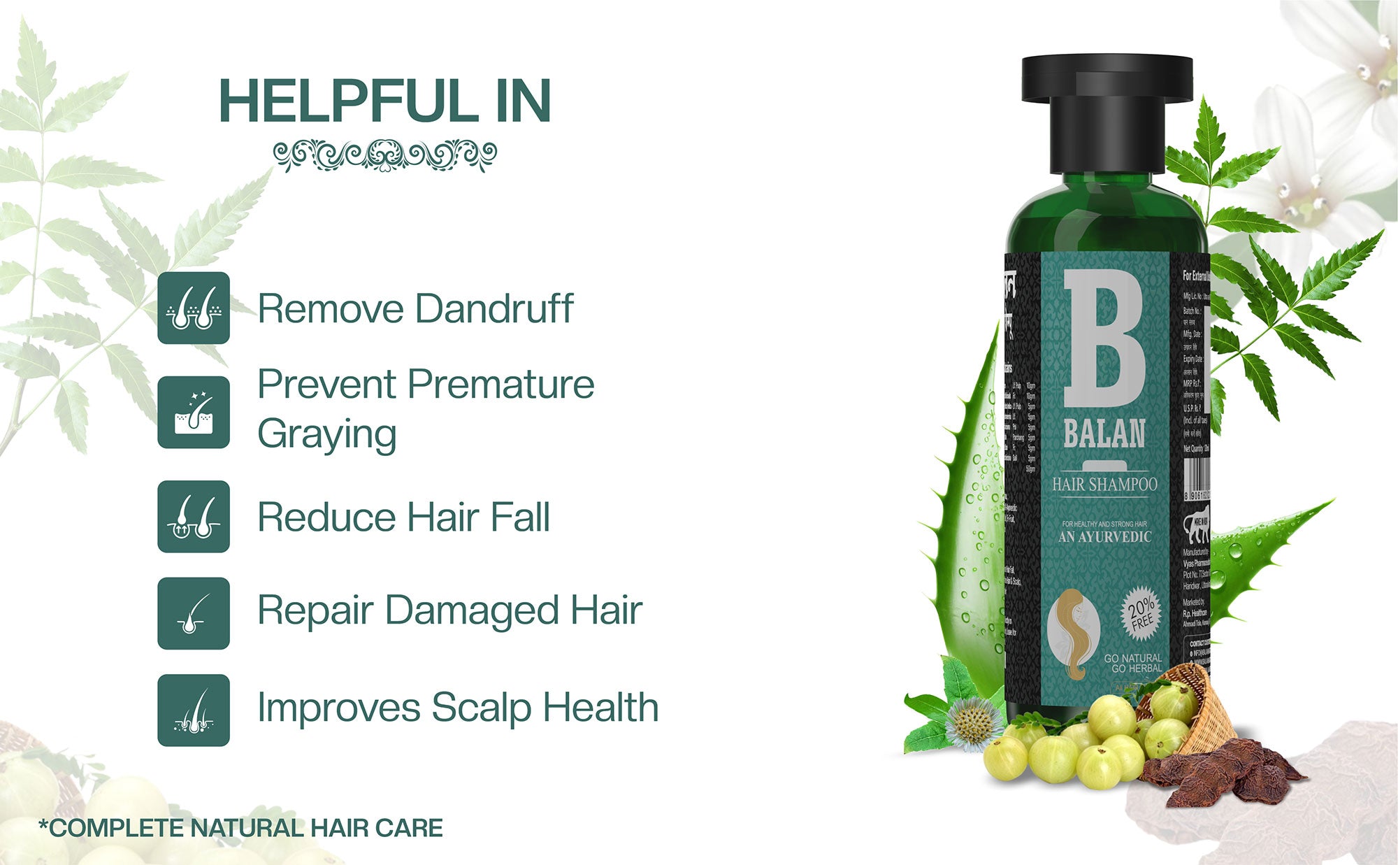 BALAN HAIR SHAMPOO INGREDIENTS: This natural Ayurvedic hair shampoo is rich in ingredients like Amla, Bhringraj, and Aloe Vera. This formula helps to maintain shoft, silky, shiny hair growth & reduce dandruff and strengthen hair follicles.
