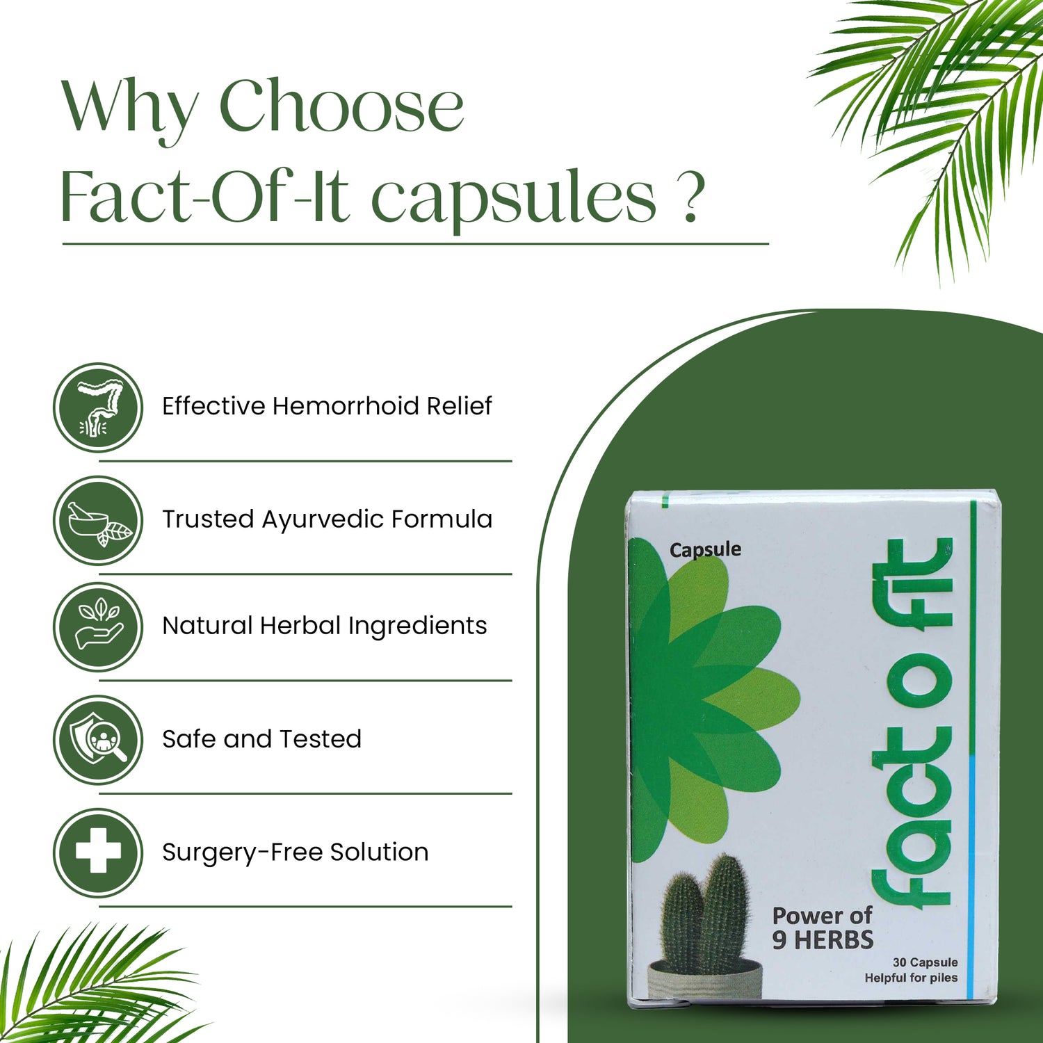 FACT-OF-FIT CAPSULES INGREDIENTS: FACT-OF-FIT Capsules contain natural ingredients such as Triphala, Haritaki, and Bael to decrease the hemorrhoids and swelling. These capsules help in reducing inflammation, relieving discomfort, and supporting overall digestive health