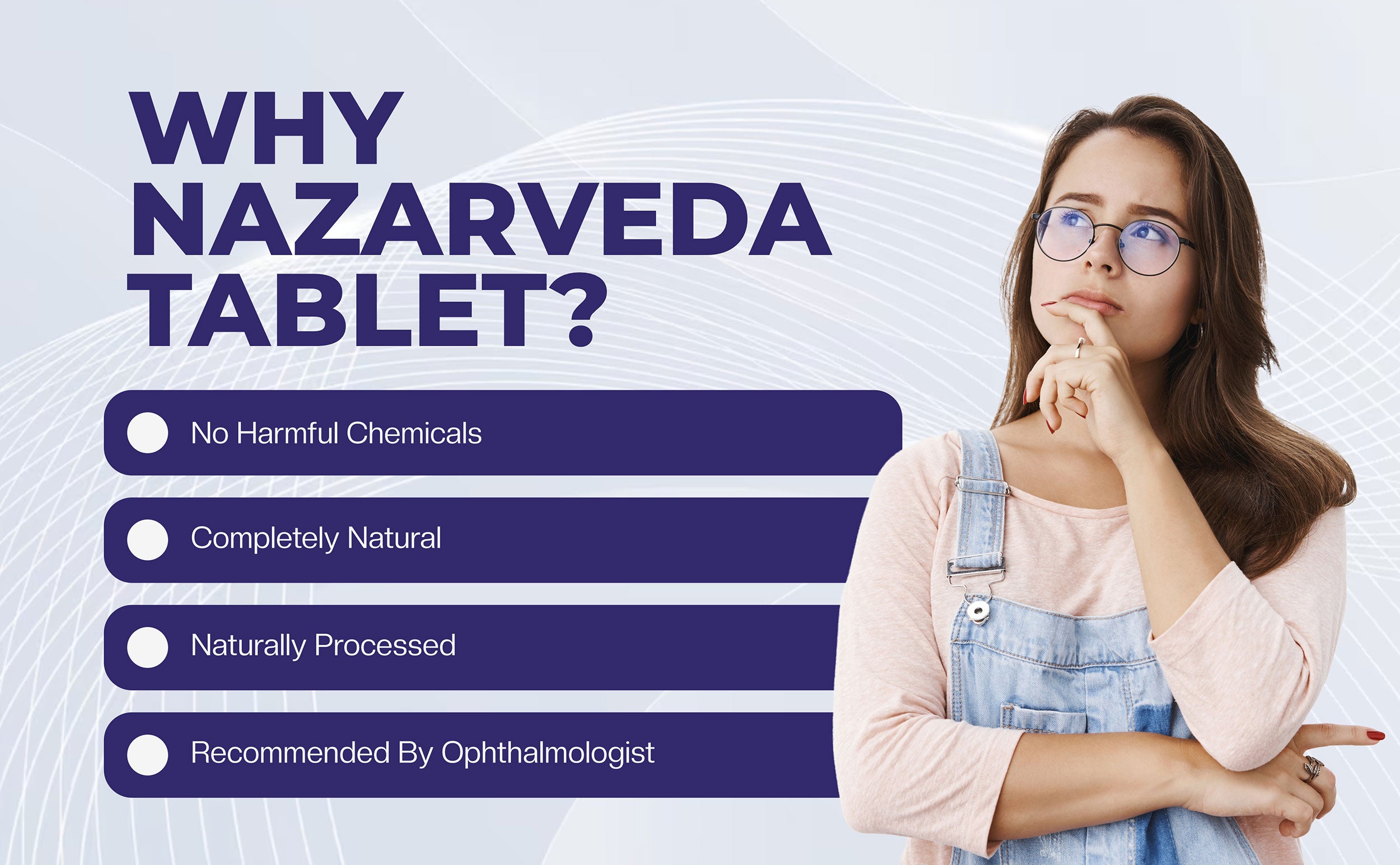 Nazarveda Tablet is a natural eye care solution, formulated with Amalki Rasayan, Bhawana, and Bhringraj, that helps relieve eye irritation, watering, and promotes clear vision, providing safe and effective results without harmful preservatives.